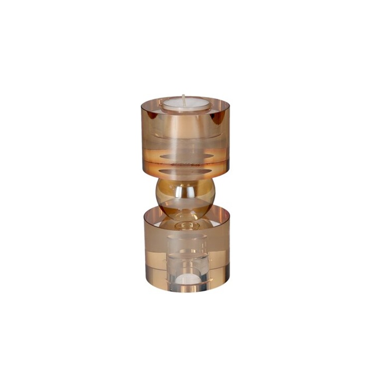 A tömör, színezett üveg rétegzett kialakítása egyedi fénytörést biztosít, amely mécses használatakor meghitt, aranyló ragyogással tölti meg a teret. A hengeres formát középen lágy gömb elem teszi karakteressé, így a mécsestartó önmagában is dekoratív design tárgy.
