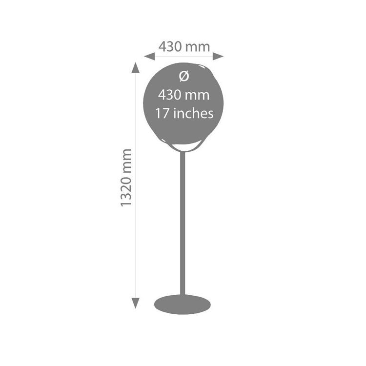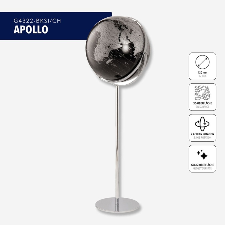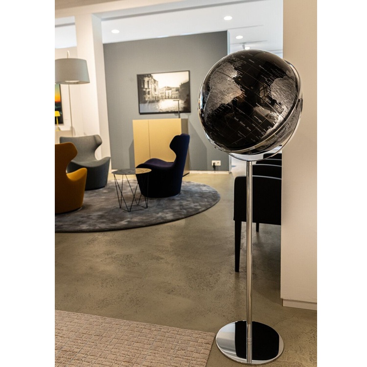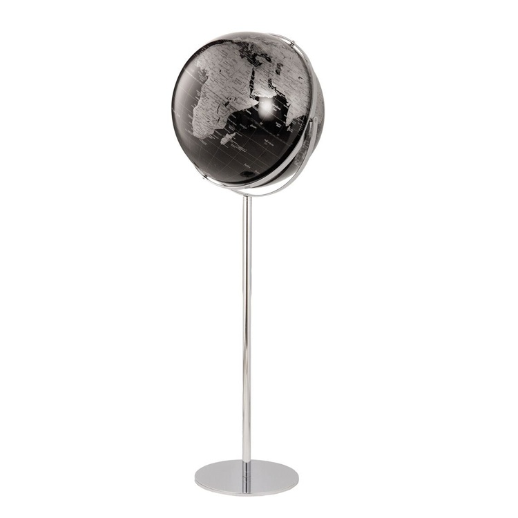 Kiváló minőségű, 132 cm teljes magasságú álló földgömb, két tengelyének köszönhetően minden szögből látható, minden irányba egyszerre mozgatható, stabil, krómozott fém kereten áll. A futurisztikus földgömb domborzati ábrázolása a hegyek kiemelésével készült.