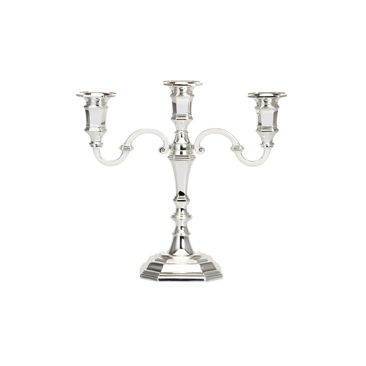Ez a fényes, ezüst színű, háromágú gyertyatartó a klasszikus elegancia megtestesítője.